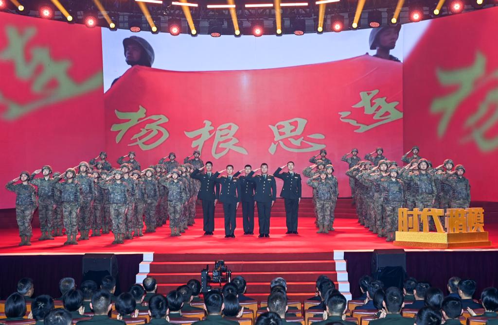 陆军某合成旅“杨根思连”官兵在“时代楷模”发布仪式上敬礼(4月28日摄)。新华社记者 张永进 摄