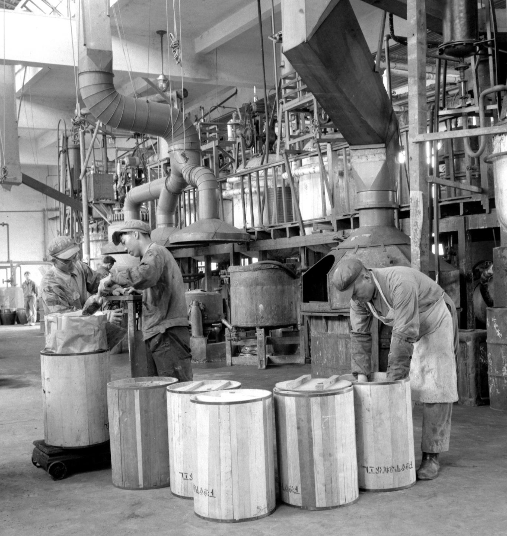 1959年,上海泰山有机化工厂的工人们在包装化工原料。