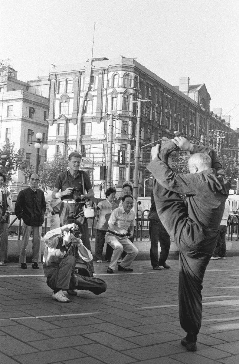 1990年,一名外国游客在上海外滩观看中国武术。