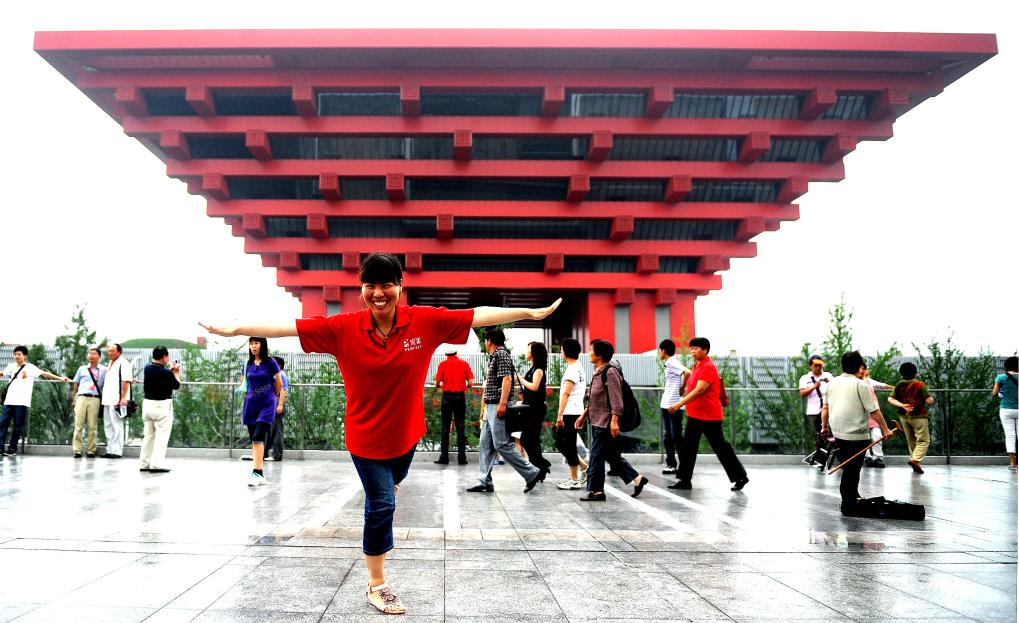 2010年6月27日,游客在上海世博园中国国家馆前拍照留念。