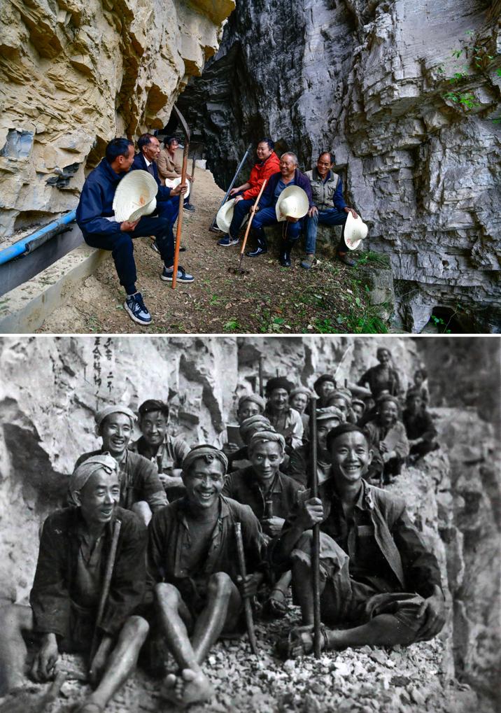 拼版照片:左图为2024年4月24日,护渠队员在生机镇巡护高流天渠;下图为1960年,村民在七星关区生机镇修凿高流天渠时的情景(王振翔摄)。