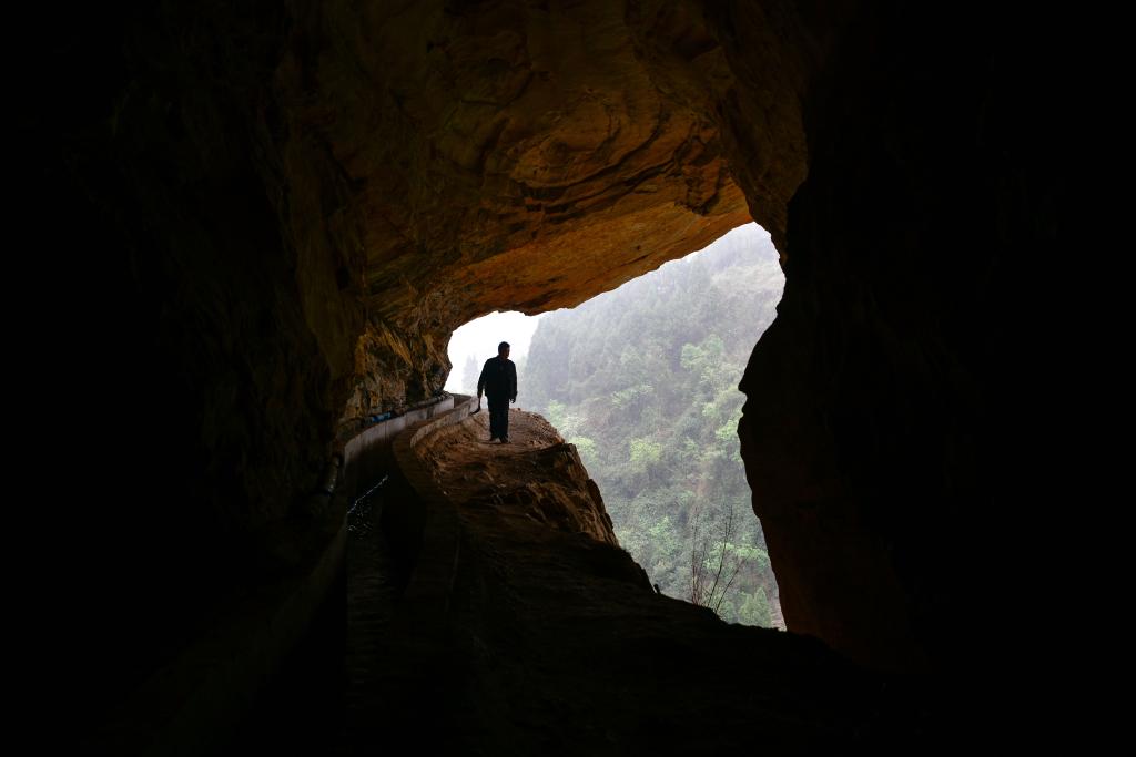 在凿渠的过程中,徐荣再三叮嘱乡亲们一定要注意安全。工程进展到几百米高的悬崖绝壁处,全是坚硬的岩石,手不能抓、脚无处站,望一眼崖底就头昏脚软。大家唯一的办法就是腰系绳索,从山顶按照规划的路线向下一点点移动,人悬挂在半空中凿出炮眼,用黑火药炸出工作面,再将其他队员吊至此处,用锤子敲、用钢钎凿……