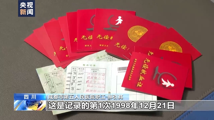 成都市第五人民医院职工 郝引其:这就是我1998年开始献血的献血证,当时国家开始提倡无偿献血,我就开始了献血。这是记录的第1次1998年12月21日,以后每一年我都献血。