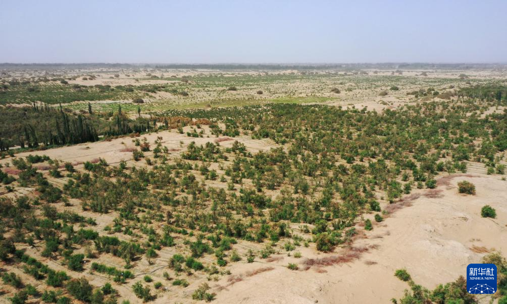 中国科学院新疆生态与地理研究所策勒沙漠研究站红柳平茬试验田(6月12日摄,无人机照片)。新华社记者 阿曼 摄