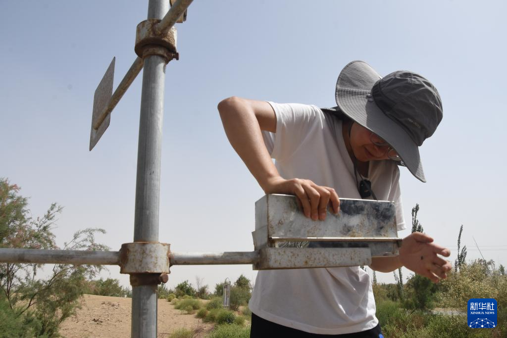 中国科学院新疆生态与地理研究所策勒沙漠研究站的科研人员利用集沙仪测量防护林的阻沙率(6月12日摄)。新华社记者 张晓龙 摄