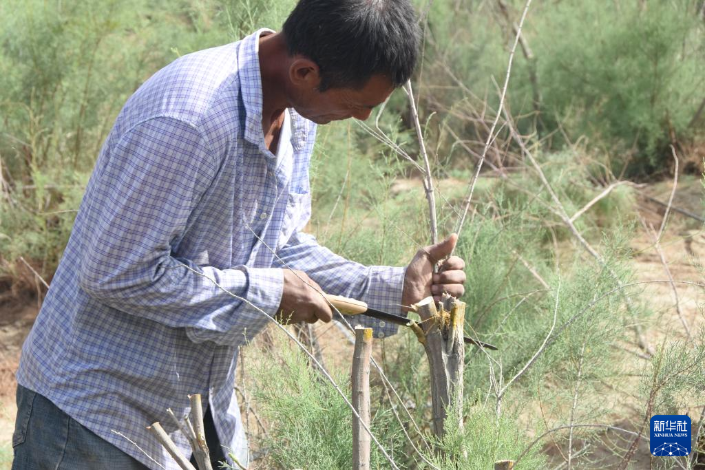 维吾尔族农民柔孜托合提·托合提库尔班使用手锯为柽柳平茬(6月12日摄)。新华社记者 张晓龙 摄