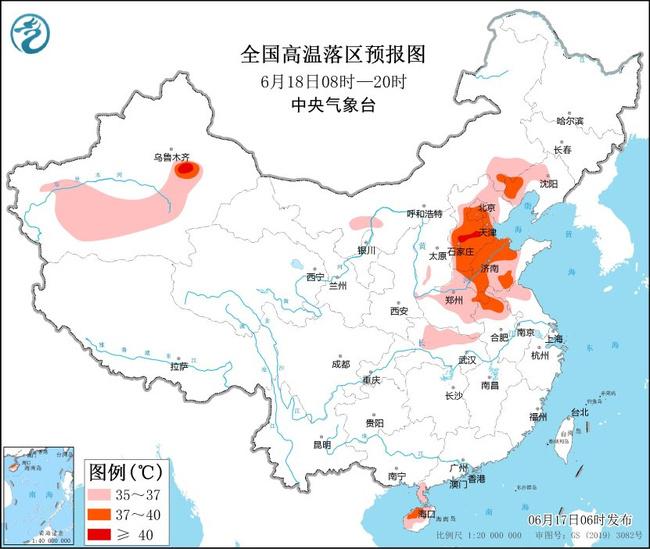 中央气象台6月17日06时继续发布高温黄色预警:预计17日白天,内蒙古西北部、新疆南疆盆地和东部、河北中南部和东北部、北京、天津、辽宁西部、山东中西部、河南东部和南部、安徽北部、湖北东北部、海南岛大部等地有35~36℃高温天气,其中,新疆南疆盆地、河北中南部、北京南部、辽宁西南部、山东北部等地部分地区最高气温37~39℃,新疆吐鲁番盆地等地局地可达40℃以上。