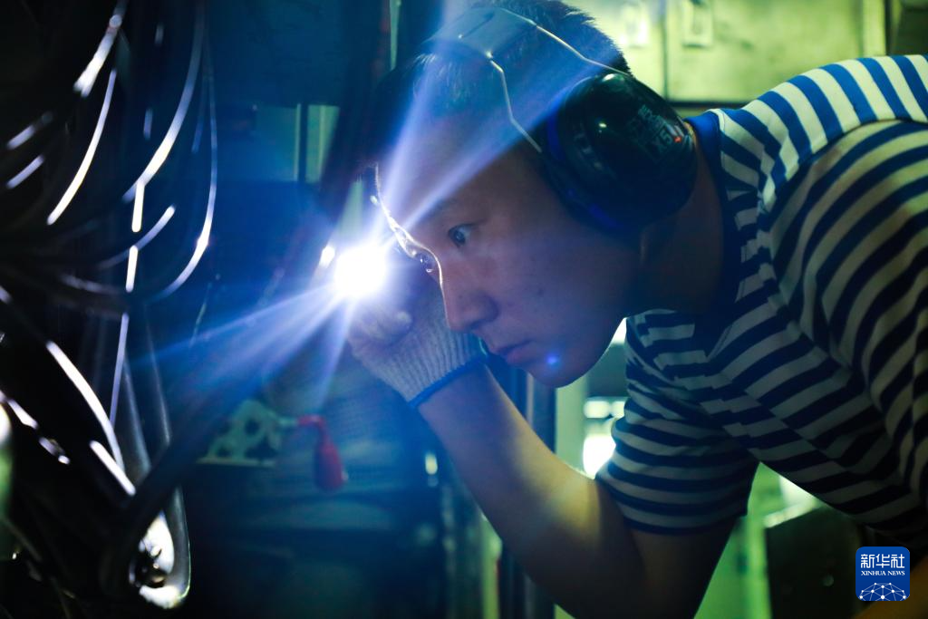 海军某潜艇支队任务潜艇组织艇员在舱底进行装备线路检修(资料照片)。新华社发(茆琳摄)