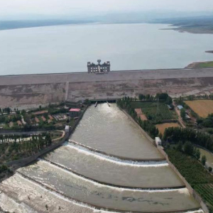 正在加大泄放流量抗旱保灌的岳城水库,图中水库坝下右边为河北邯郸民有渠、左为河南安阳漳南渠。新华社记者 刘诗平 摄