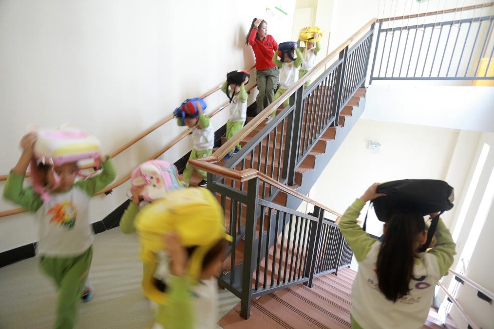2023年10月13日,江苏省扬州大学附属西郡幼儿园的老师组织小朋友进行逃生演练。新华社发(孟德龙 摄)