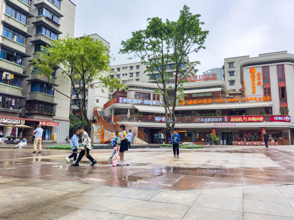 4月21日,几名小孩在重庆市九龙坡区谢家湾街道民主村片区城市更新项目(一期)广场游玩,背后是琳琅满目的餐饮店。新华社记者 黄伟 摄