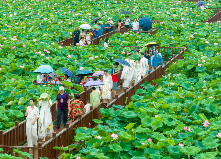 游客在荷花丛流连忘返。柳斌 摄