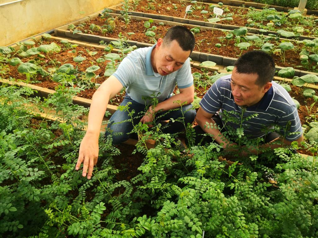 2024年5月24日,中国林业科学研究院研究员黄秦军(左一)在黔南州林业局育苗基地观测刺梨太空种子苗木。(韦蓉静 摄)