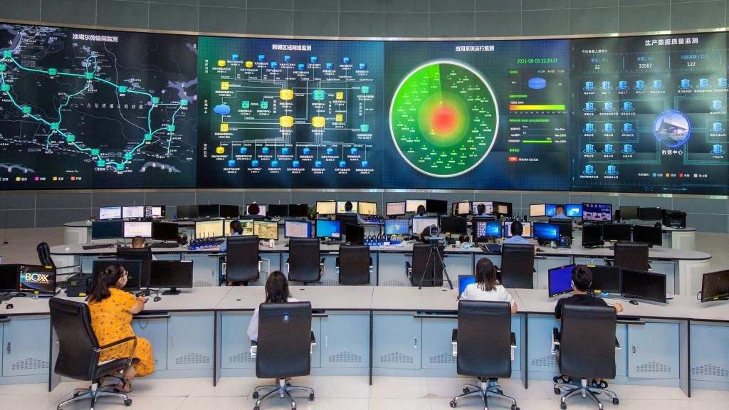 2023年12月6日,中国石油新疆油田公司生产指挥中心的监控大屏实时显示油田生产动态数据。新华社发(闵勇 摄)