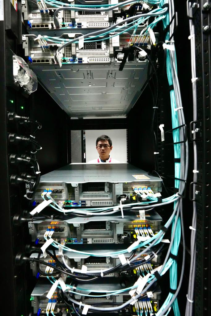 2月27日,克拉玛依云计算产业园区华为云服务数据中心,技术人员正在巡查。新华社发(崔文娟 摄)