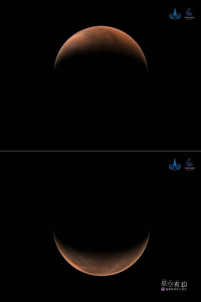 2021年3月26日,国家航天局发布2幅由天问一号探测器拍摄的南、北半球火星侧身影像。这是一张拼版照片,上图为北半球上方火星影像,下图为南半球上方火星影像。(新华社发)