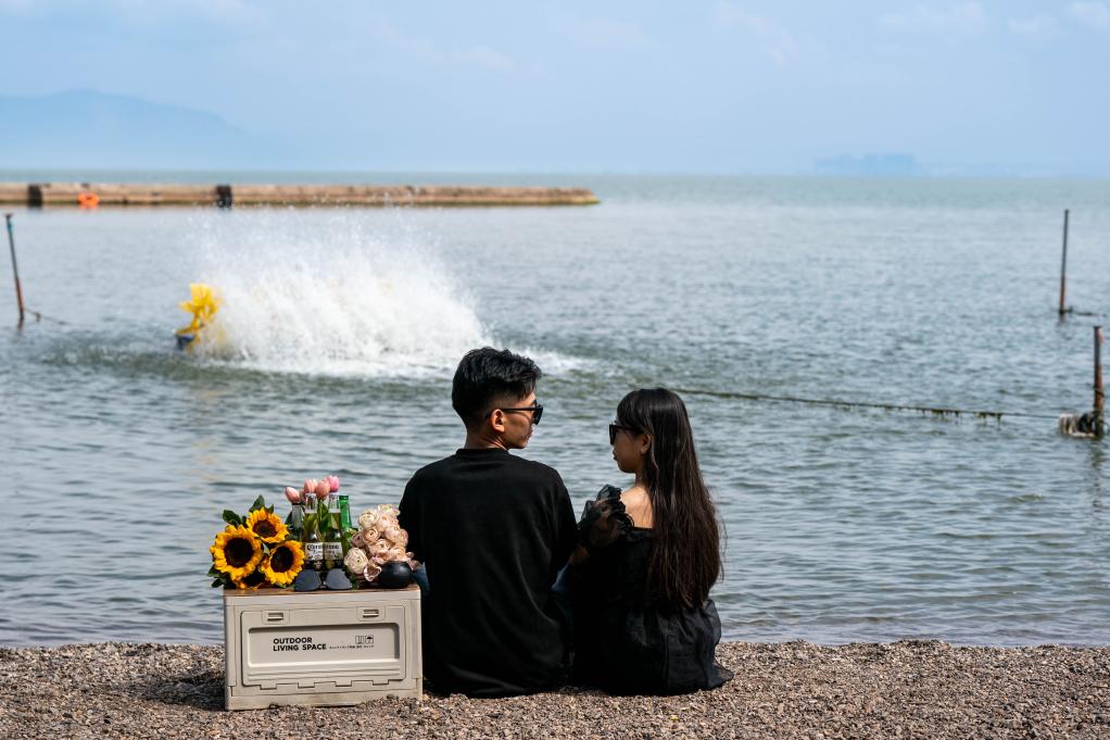 游客在云南省昆明市晋宁区海晏村打卡拍照(2024年5月22日摄)。新华社记者 胡超 摄