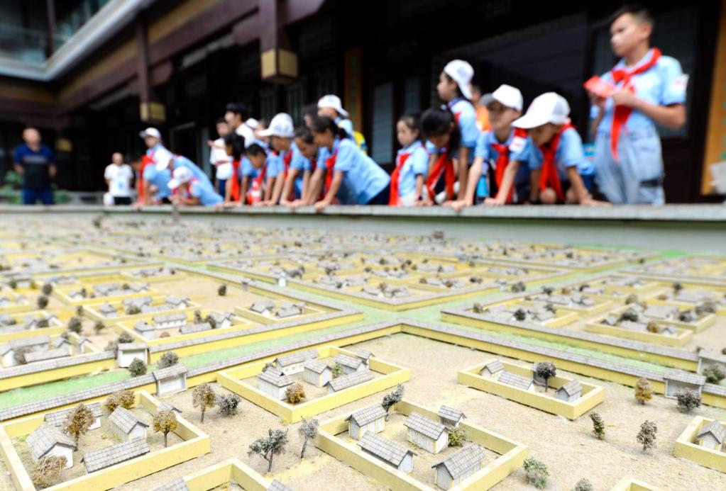 2019年8月7日,参加夏令营的少先队员们在河北邯郸临漳县邺城博物馆内参观。新华社发