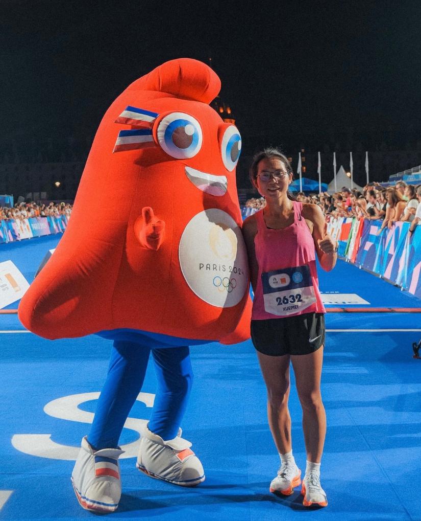 黄雪梅(右)在巴黎奥运会大众马拉松比赛中↑