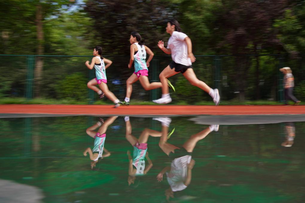 8月8日,跑步爱好者在山东省淄博市高青县一处公园里跑步健身。新华社发(张维堂摄)