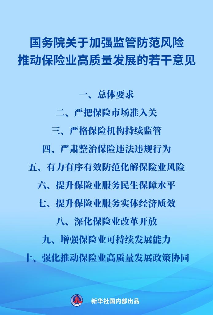 我国保险业发展迎来新的顶层设计。9月11日,国务院对外发布《关于加强监管防范风险推动保险业高质量发展的若干意见》。若干意见共10条,被业内称为保险业新“国十条”,对我国保险业未来5年到10年左右的发展进行系统部署。这是继2006年、2014年之后,国家层面又一次对保险业发展作出的全面部署,释放了进一步推动我国保险业高质量发展的鲜明信号。