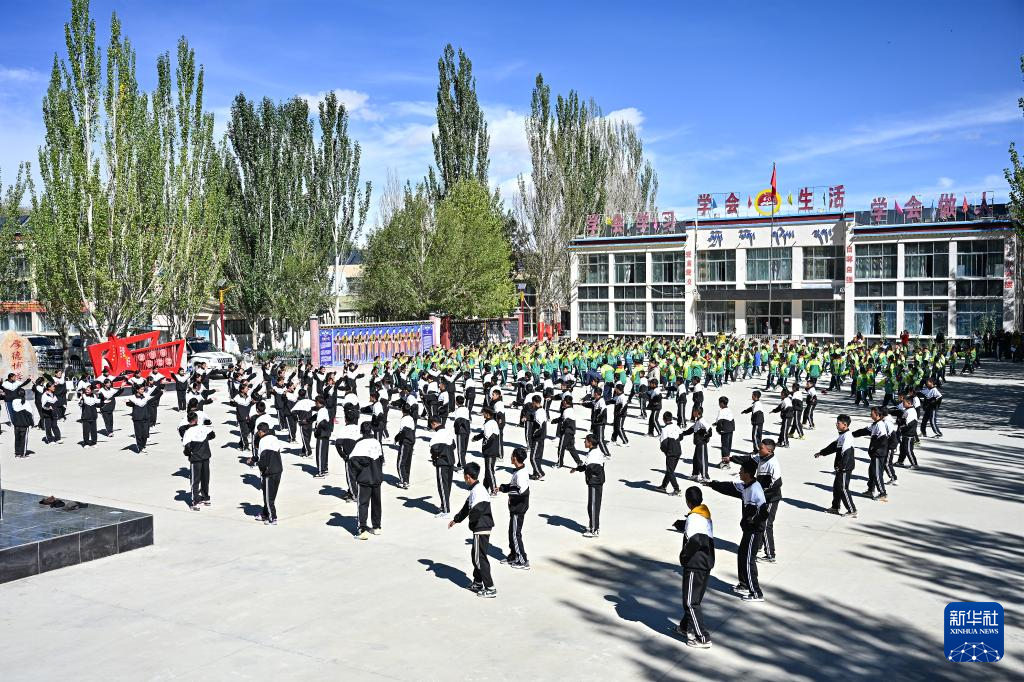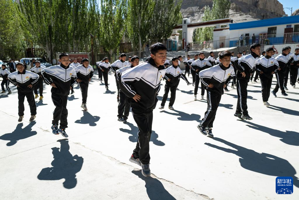在西藏阿里地区札达县九年一贯制学校,孩子们跳起融入国家级非物质文化遗产“宣舞”特色的课间操(9月10日摄)。新华社记者 孙瑞博 摄