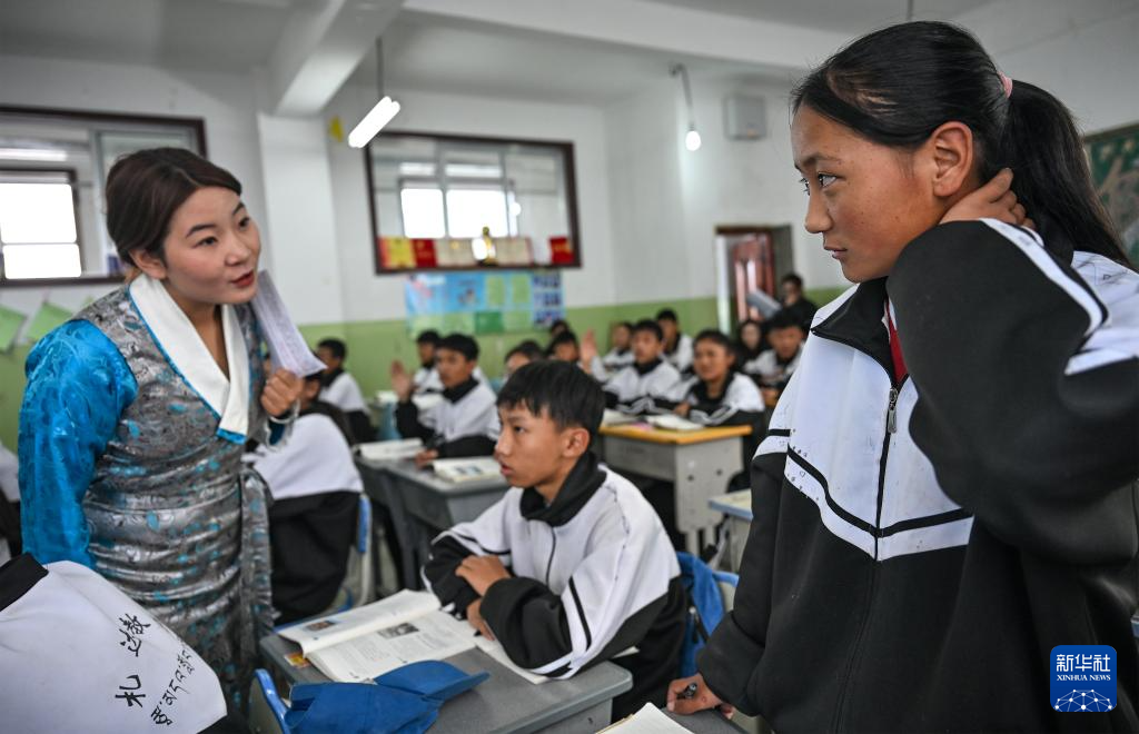 在西藏阿里地区札达县九年一贯制学校,老师次仁曲加给初三(2)班的学生上课(9月10日摄)。新华社记者 孙瑞博 摄
