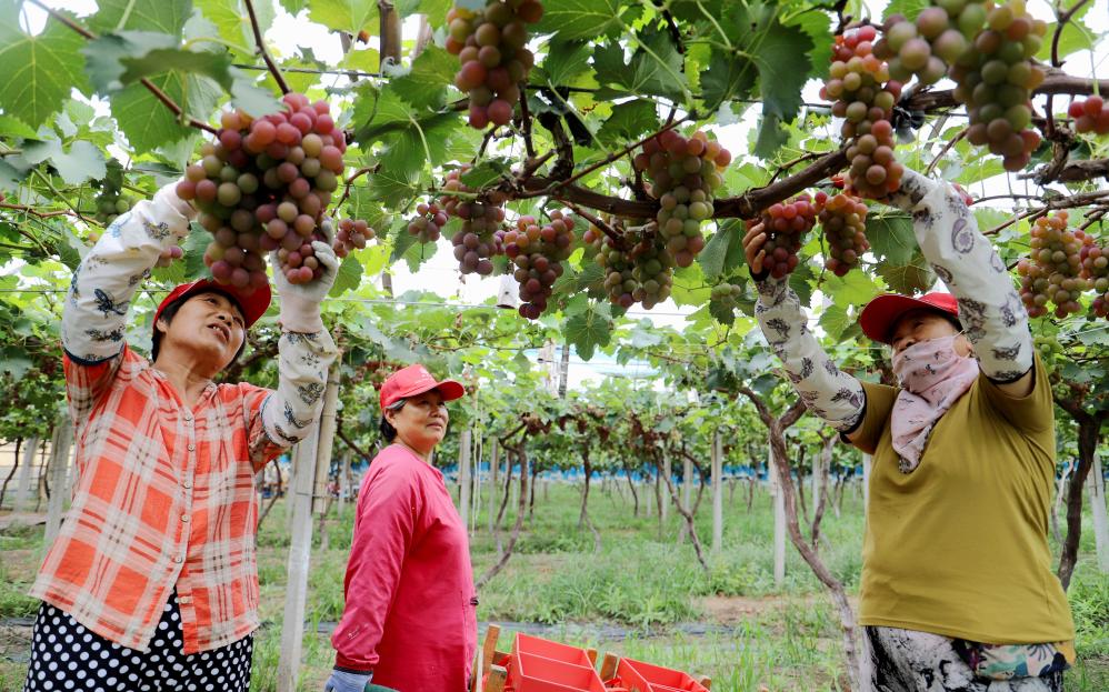 在高密市阚家镇松兴屯村的千亩鲜食葡萄园,村民们忙着采摘成熟的葡萄。新华社记者 王志 摄