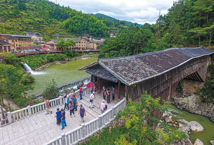游客在下党乡下党村古廊桥“鸾峰桥”参观游览(2019年8月8日摄)。记者林善传摄