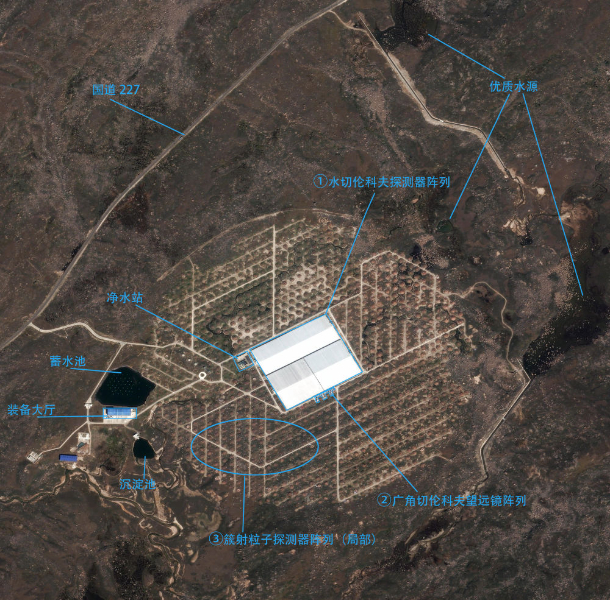 从卫星影像示意图上可以看到,“拉索”毗邻国道,地势整体平坦,优质水源丰富。得益于世界屋脊的高海拔优势和多项关键核心技术的突破,“拉索”集合了三项“世界之最”:最灵敏的超高能伽马射线探测装置,最灵敏的甚高能伽马射线源巡天普查望远镜,能量覆盖范围最宽的超高能宇宙线复合式立体测量系统。自2021年“拉索”完成建设投入使用以来,成绩斐然。