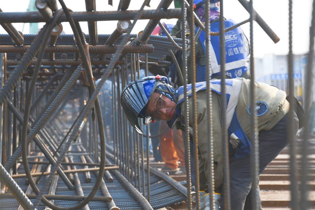 胡建国和工友们一起,把不同型号的钢筋抬放到简易工台上,连接拼装起来,为焊接作准备(9月12日摄)。