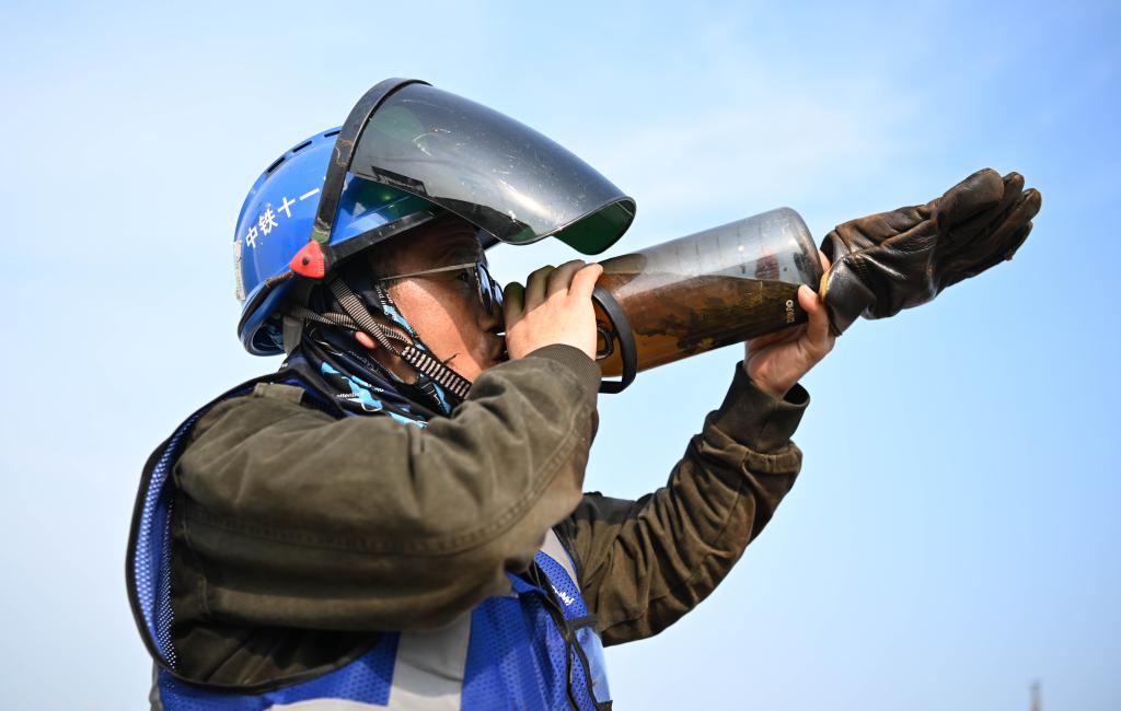 胡建国在工作间隙补充水分(8月27日摄)。