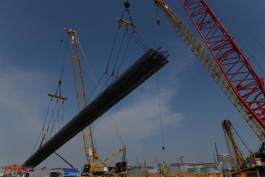 履带吊正在把加工好的钢筋笼从工作台上吊往施工地(8月27日摄)。