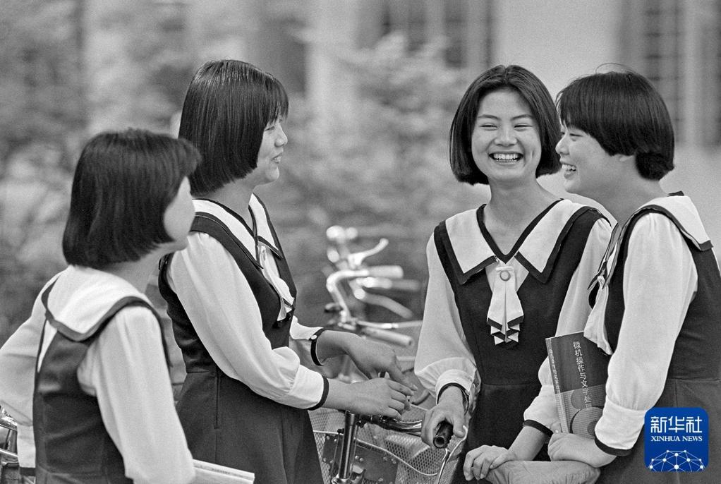 1994年5月27日,江苏南京市女子中专的几名女学生穿着校服,在校园里聊天。新华社记者 徐澎 摄