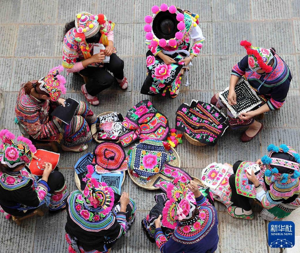 2014年7月21日,云南楚雄彝族自治州永仁县的彝族绣娘们围坐在一起,绣制传统服装。新华社记者 杨宗友 摄