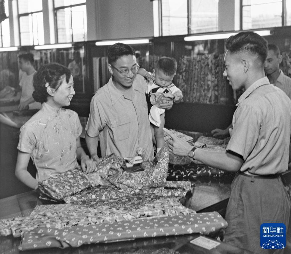 1950年,中国百货公司上海市公司第一百货商店绸缎部的营业员正在帮助顾客选购花绸布料。新华社记者 杨溥涛 摄