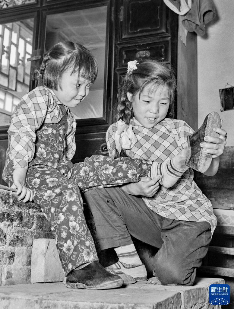 1957年,在山西太谷县一家农户里,姐姐为妹妹穿上新买的胶鞋。新华社记者 张瑞华 摄