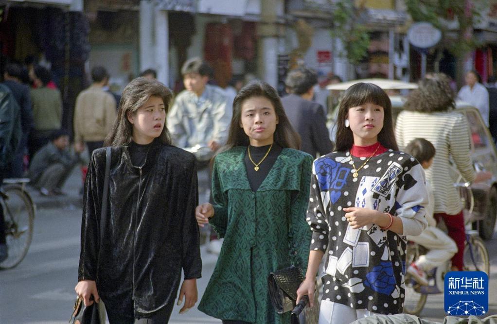 1992年,身着大垫肩上衣的女青年行走在浙江温州街头。新华社记者 郑震孙 摄