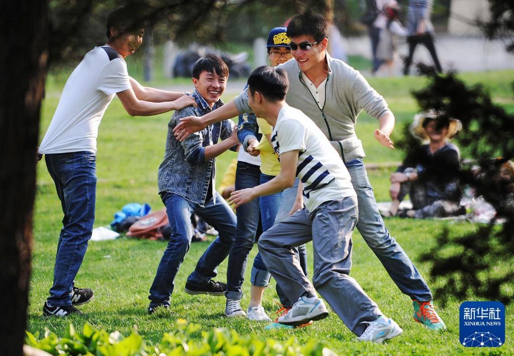 2014年5月1日,一群身穿牛仔裤的男青年在黑龙江省森林植物园内嬉戏,享受与大自然的“约会”。新华社记者 王建威 摄