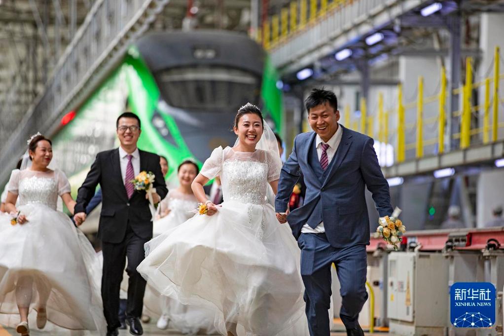 2023年5月20日,在山西太原,身穿西式礼服的新人举办集体婚礼。新华社记者 许雄 摄