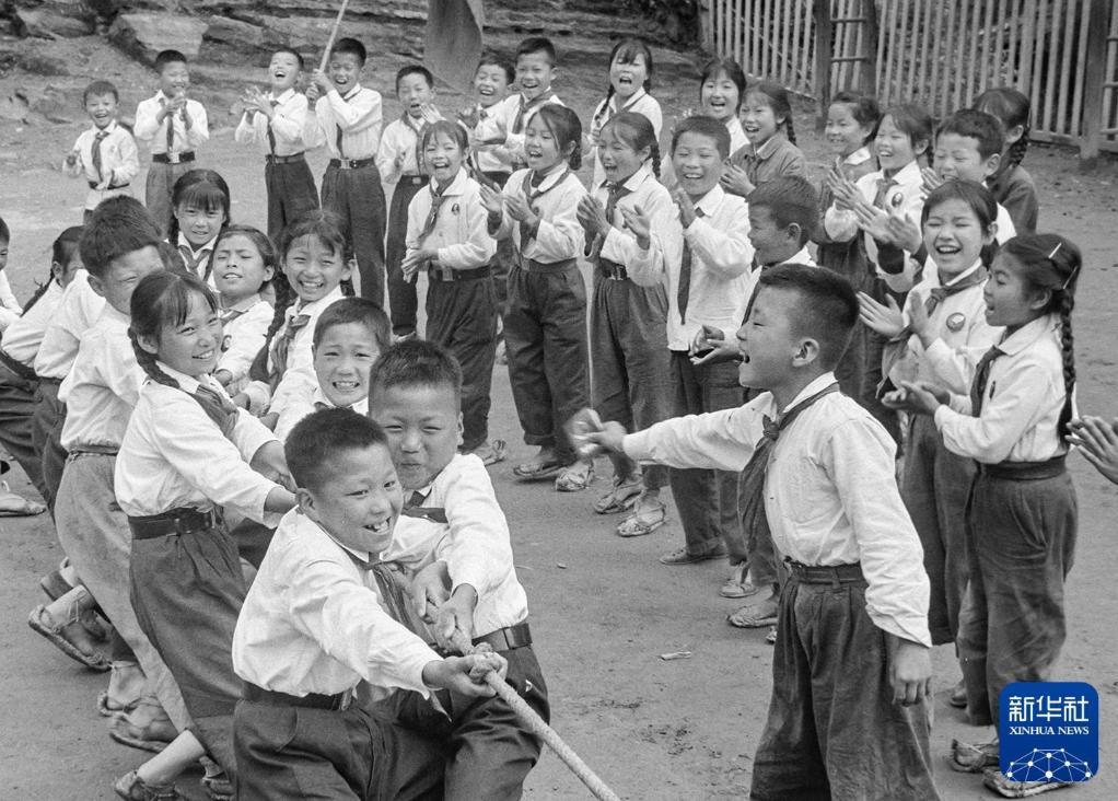 20世纪70年代,佩戴红领巾、身着白衬衫的少年儿童在进行拔河比赛。新华社发