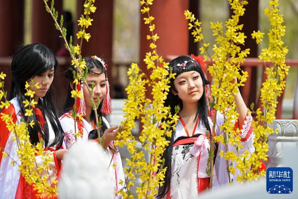 2015年4月5日,甘肃兰州三名身穿cosplay服装的女孩在公园赏花。新华社记者 陈斌 摄