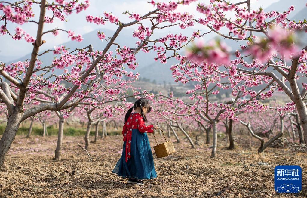 2020年3月26日,在四川雅安汉源县双溪乡申沟村,一名身着汉服的小女孩走在鲜花盛开的桃树下。新华社记者 王曦 摄