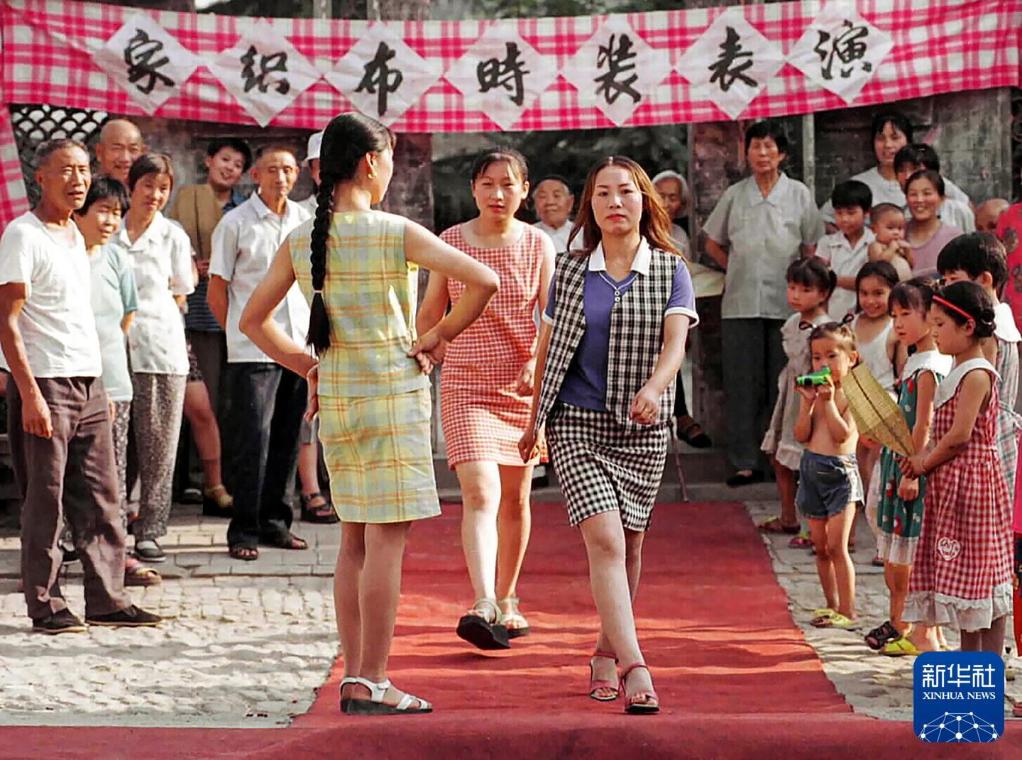 2002年10月11日,陕西韩城党家村,几名农家女展示用自家织的土布制作的时装。新华社发