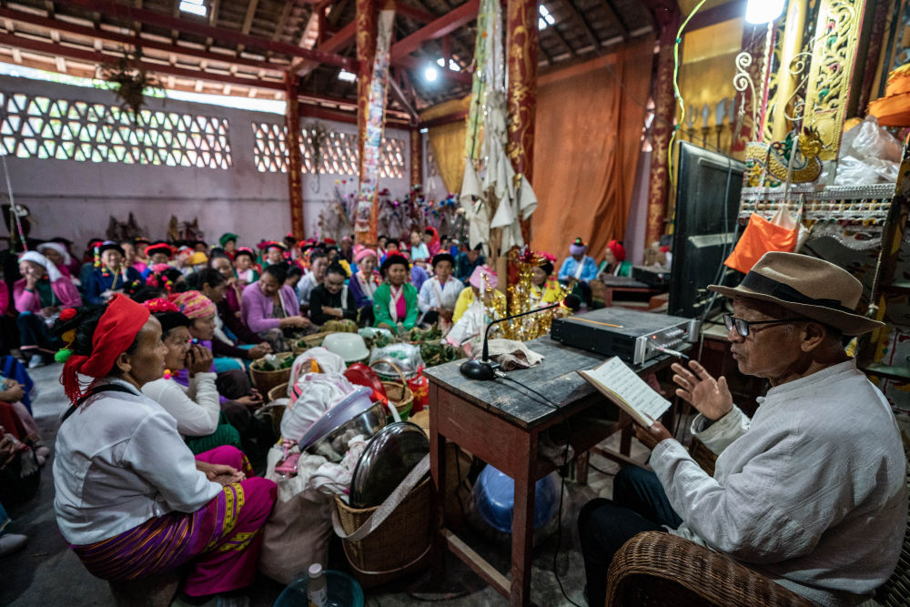 2023年9月14日,在云南省普洱市澜沧拉祜族自治县景迈山芒景村的文化活动室,布朗族老人苏国文(右)给村民讲课。新华社记者 胡超 摄