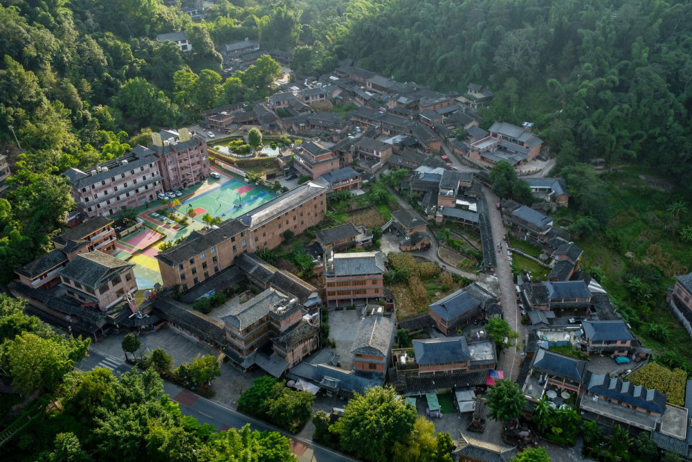 被山林与茶园环绕的云南省普洱市澜沧拉祜族自治县景迈山翁基古寨一景(2024年9月13日摄,无人机照片)。新华社记者 胡超 摄