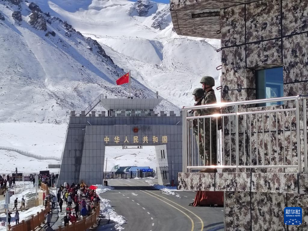 9月30日,红其拉甫边防连国门前哨班官兵在哨楼站岗执勤。新华社发(麻勇摄)