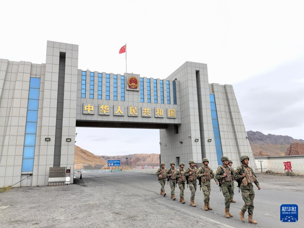 9月30日,斯姆哈纳边防连国门前哨班官兵巡逻走过国门。新华社发(陈斌 摄)