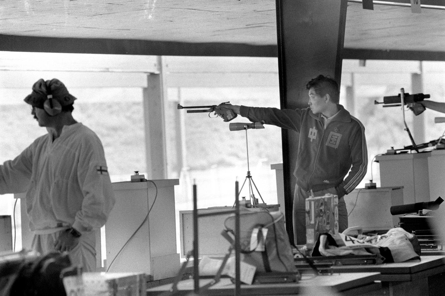 1984年7月29日,中国运动员许海峰(右)在奥运会男子自选手枪射击比赛中。许海峰以566环的成绩获得这个项目的冠军,夺得本届奥运会的第一枚金牌。新华社记者 官天一 摄(传真照片)