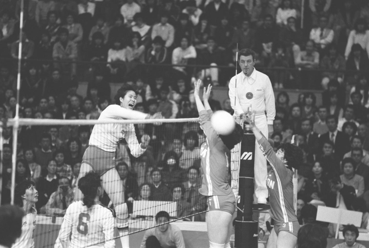 1981年11月16日,在日本大阪,中国队以3:2战胜日本女排,夺得第三届世界杯女子排球赛冠军。这是郎平在扣球。黎启榕 摄(新华社稿)